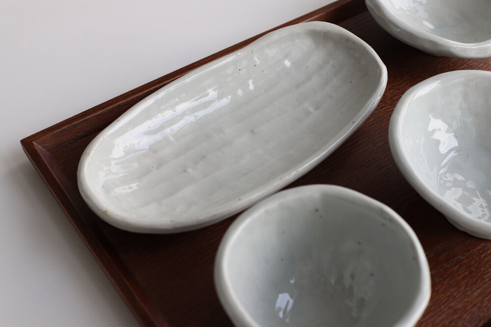 긴타원접시에는 3가지 반찬을 조금씩 담아내기도 좋고 계란말이,두부 등 전을 담기에 좋습니다.