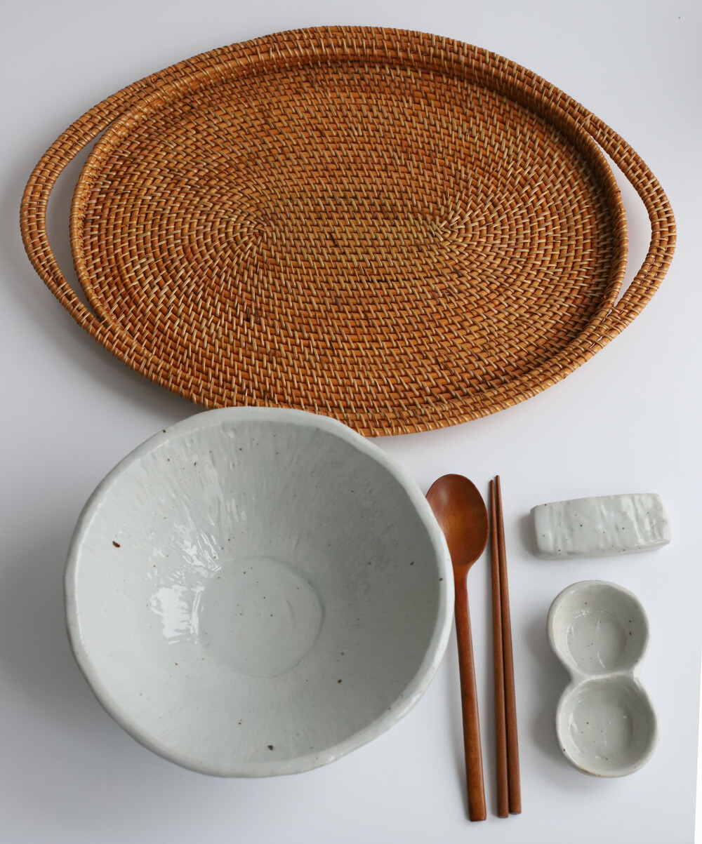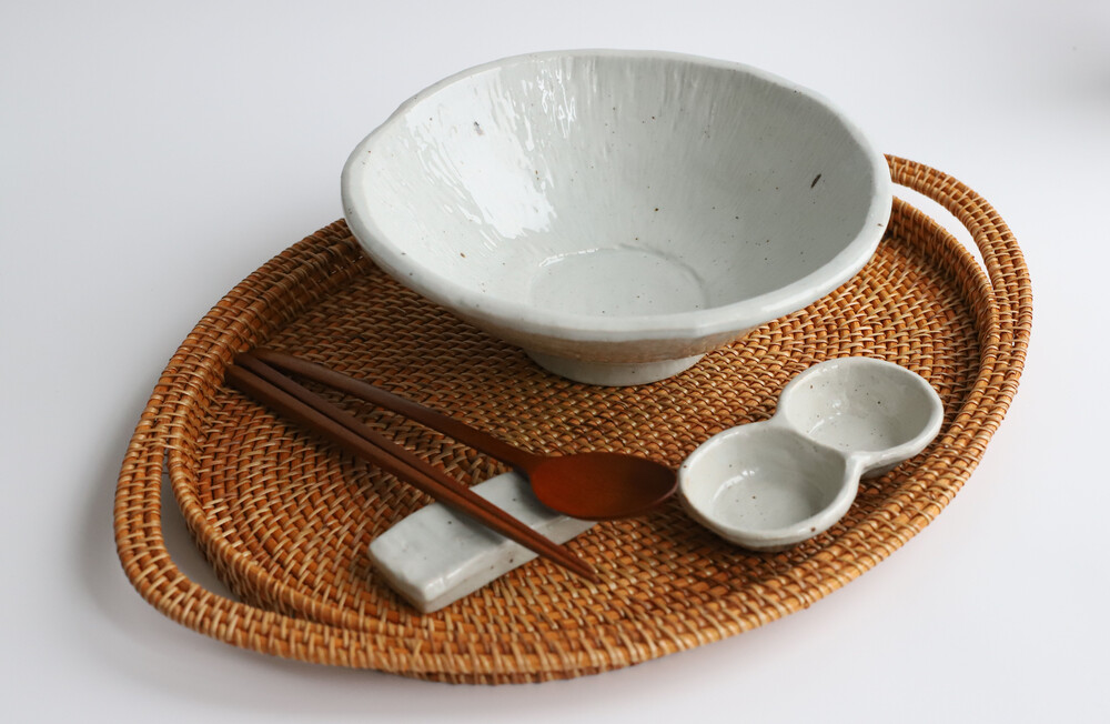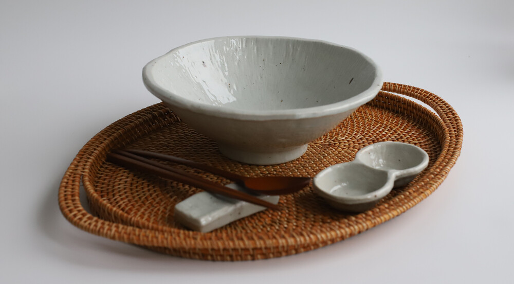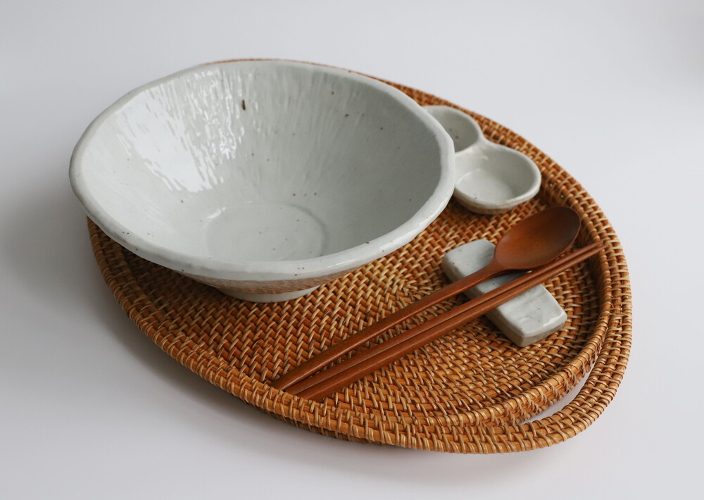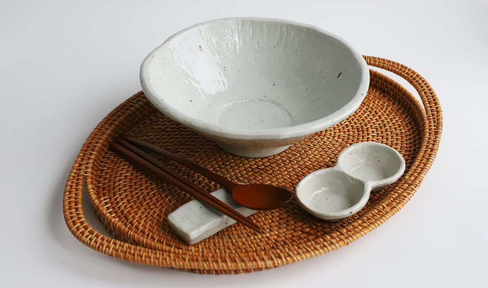 손으로 엮어 만든 트레이 색과 도자기그릇이 참 잘어울리지요?
