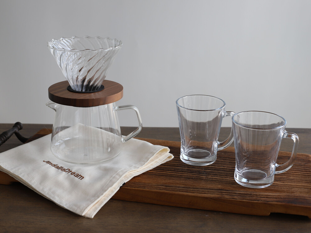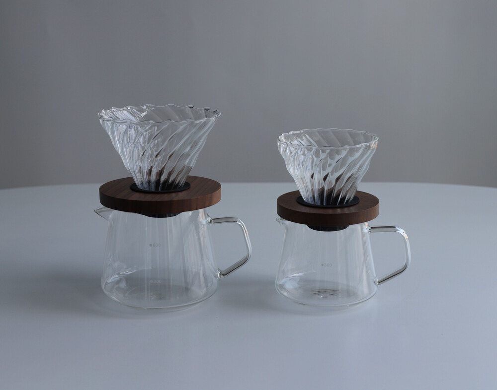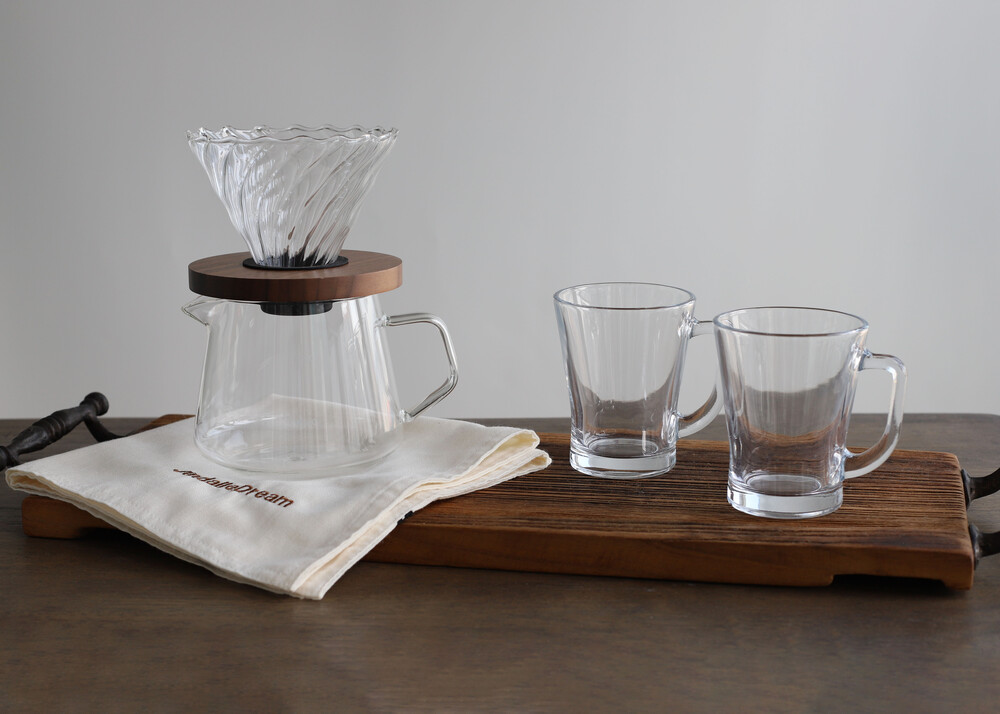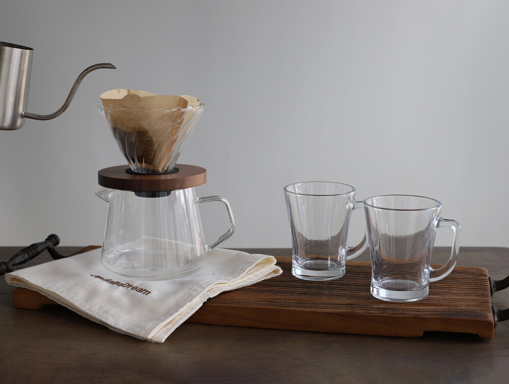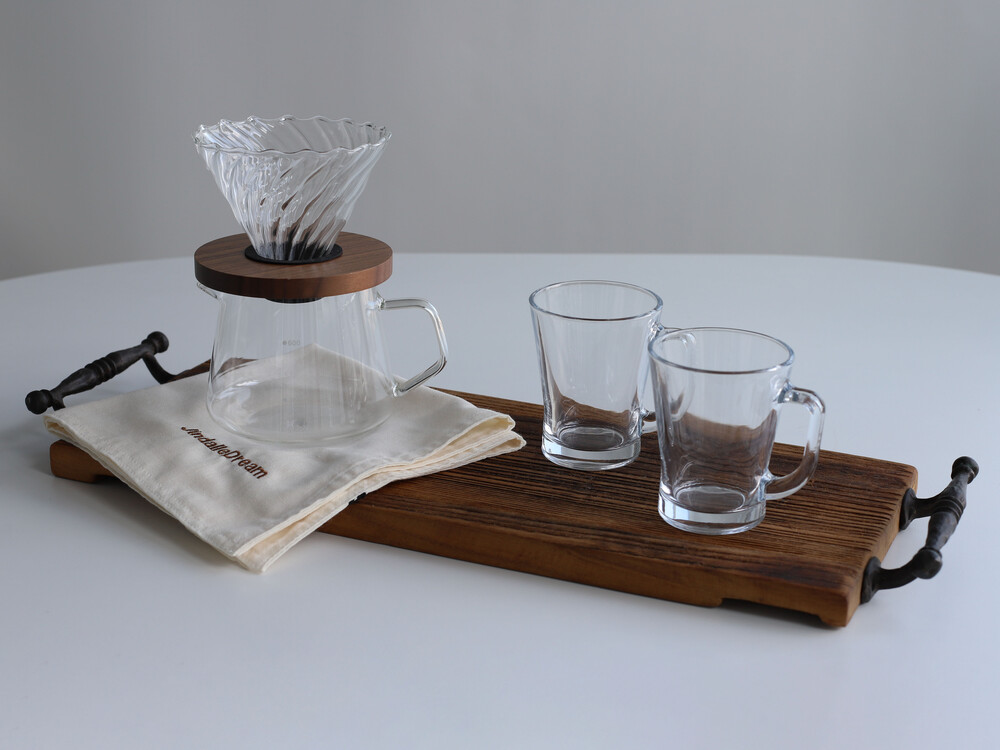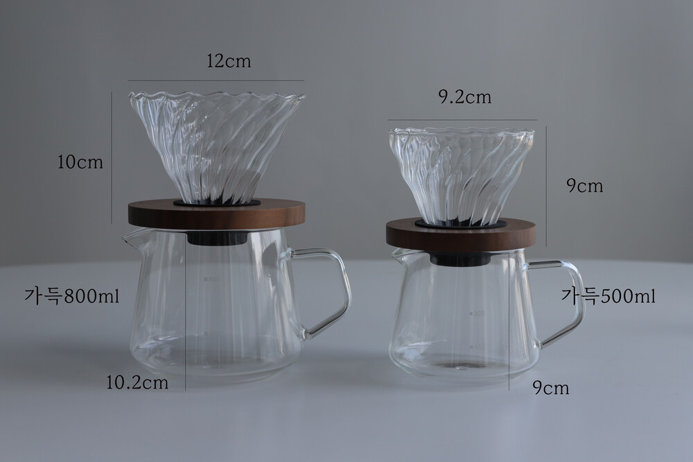 튼튼하고 내구성이 좋은 내열유리서버와 단단하고 고급스러운 월넛, 호두나무로 제작된 드리퍼와 유리컵까지 구성된