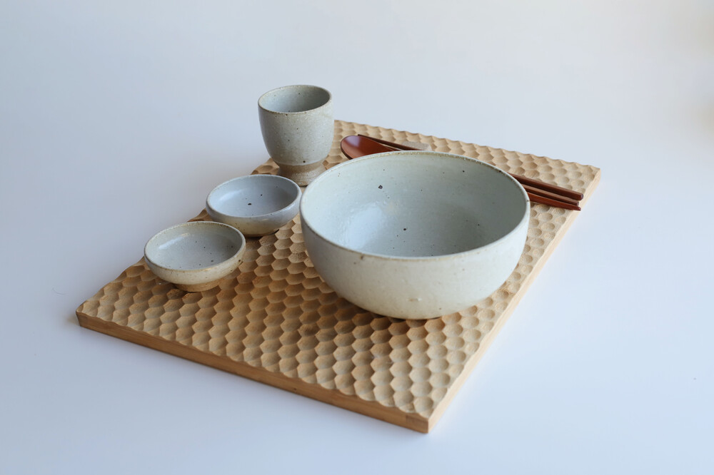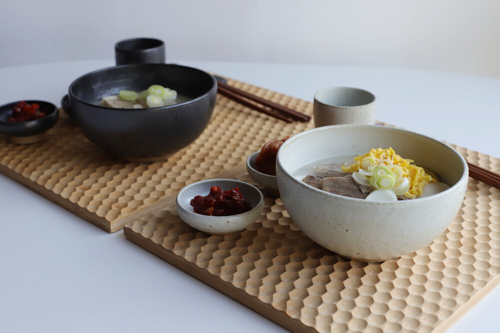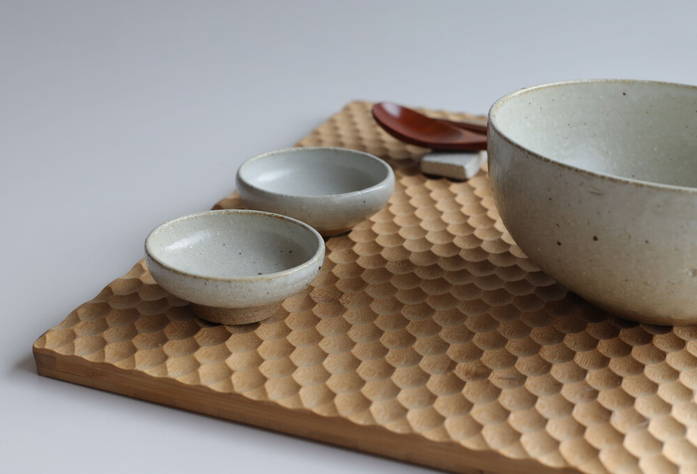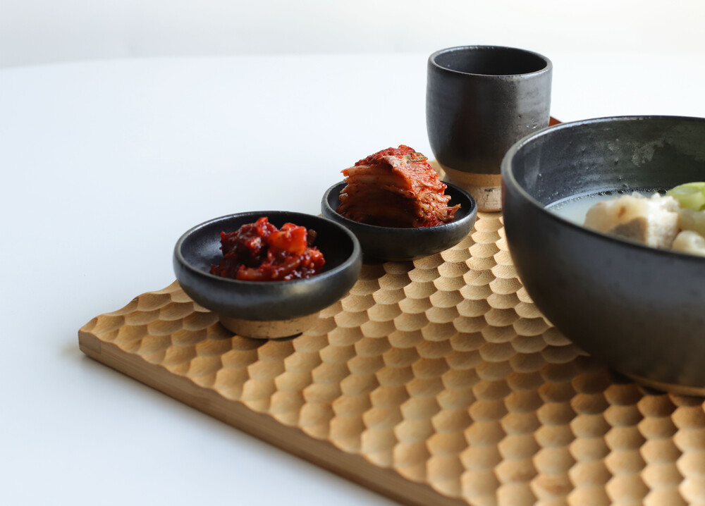 이 트레이는 대나무로 색상이 밝아 어떤 그릇과도 잘어울리고 벌집모양으로 디자인이 들어가