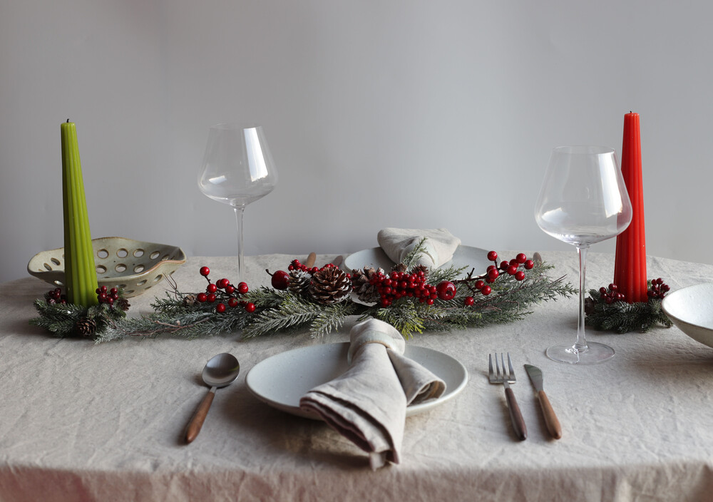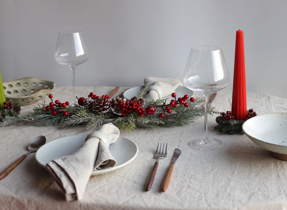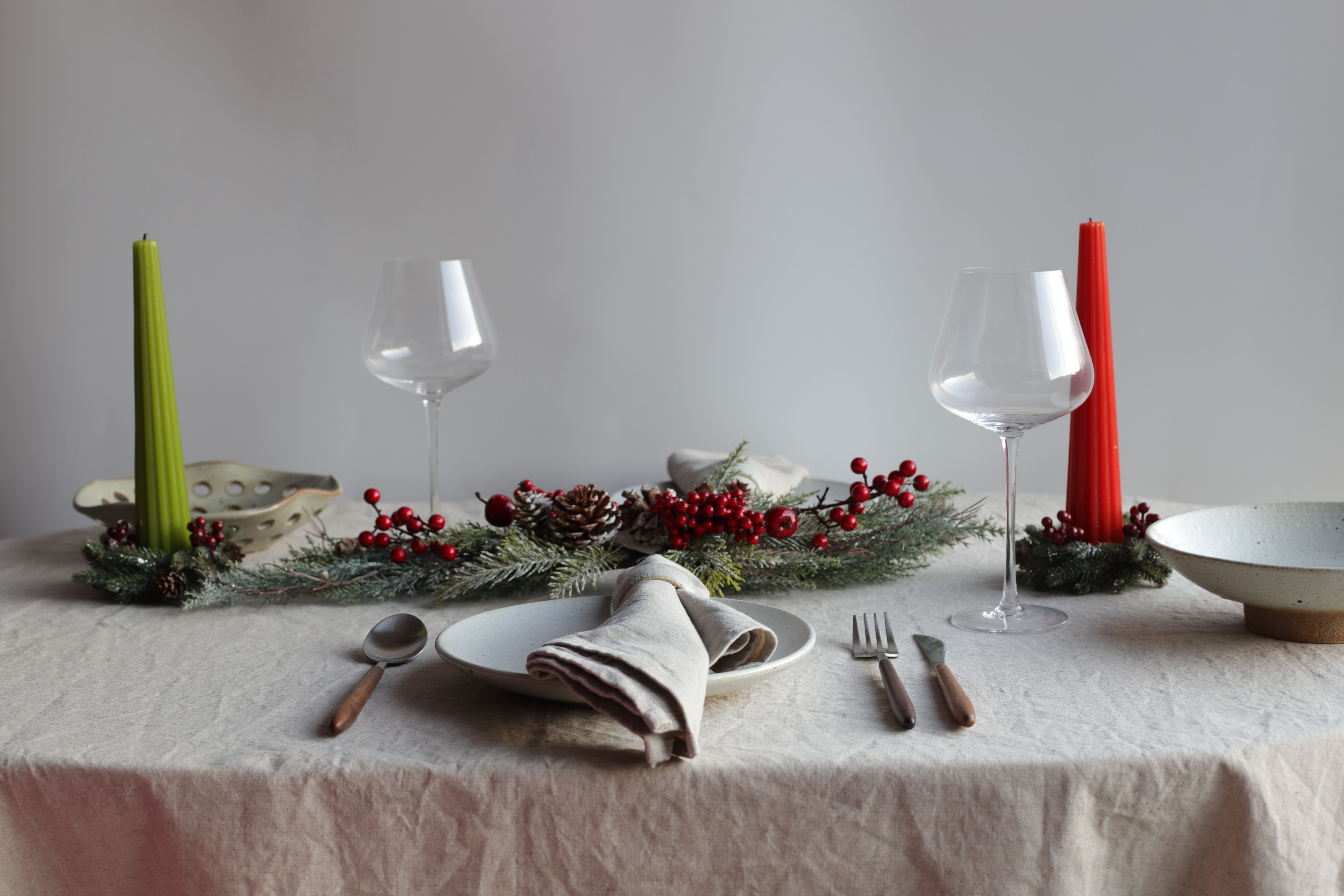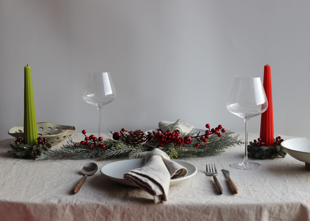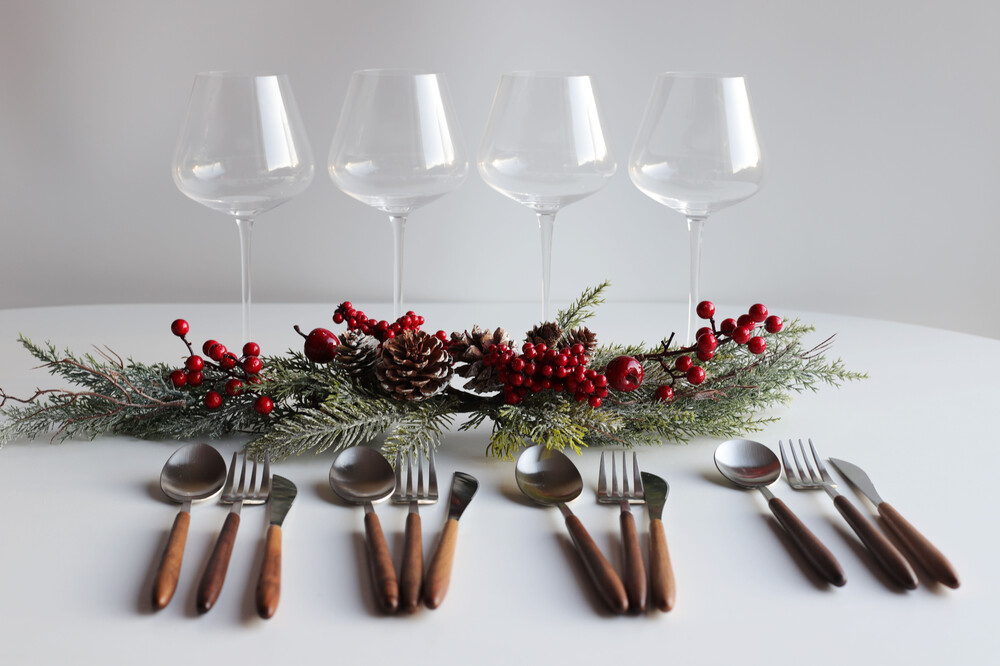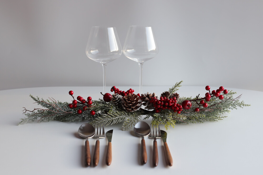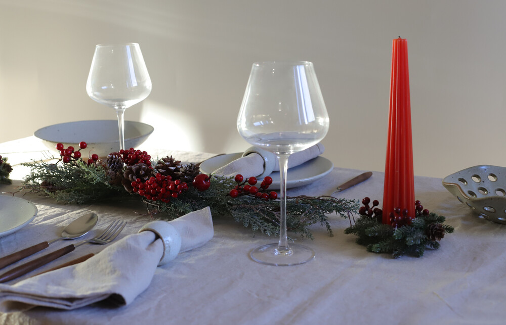 차분한 겨울 분위기에 어울리는 와인잔, 커트러리, 그리고 핸드메이드 센터피스를 더해