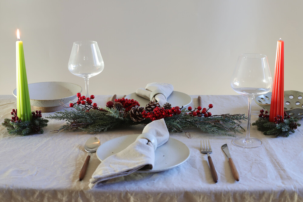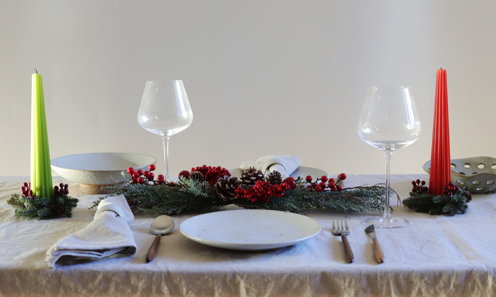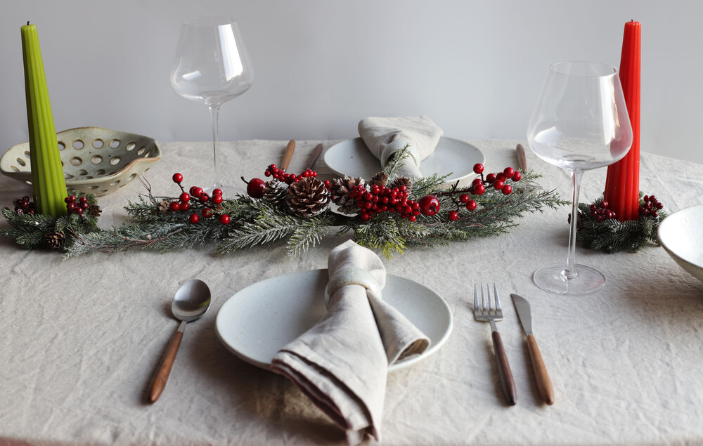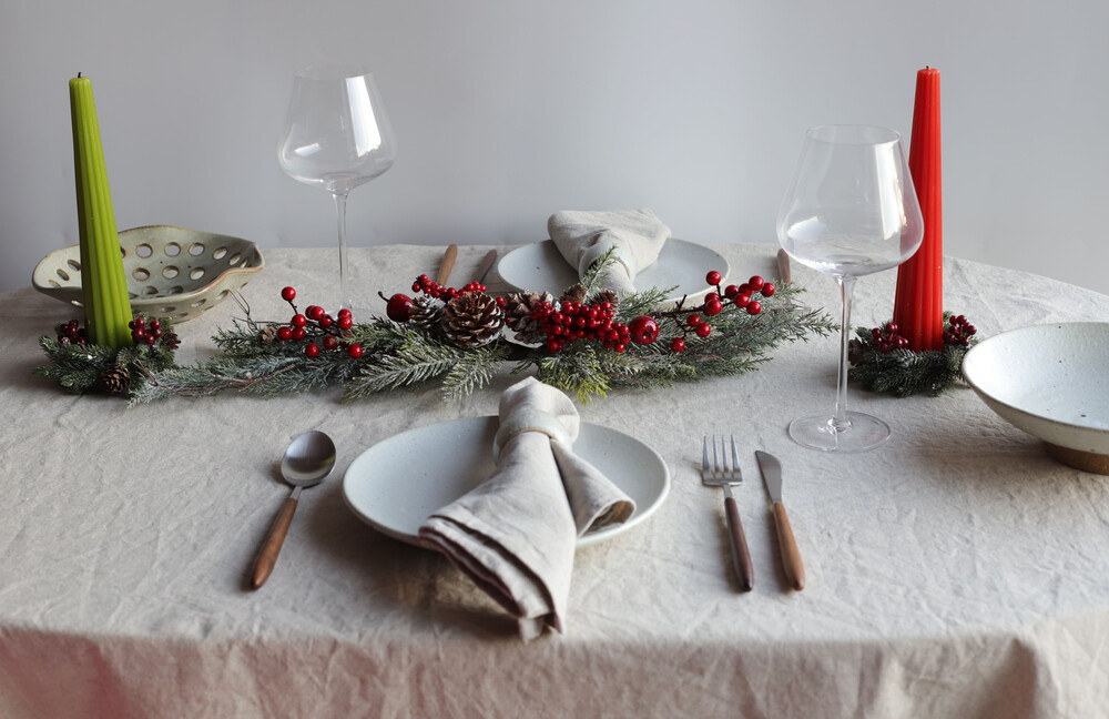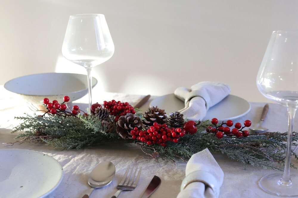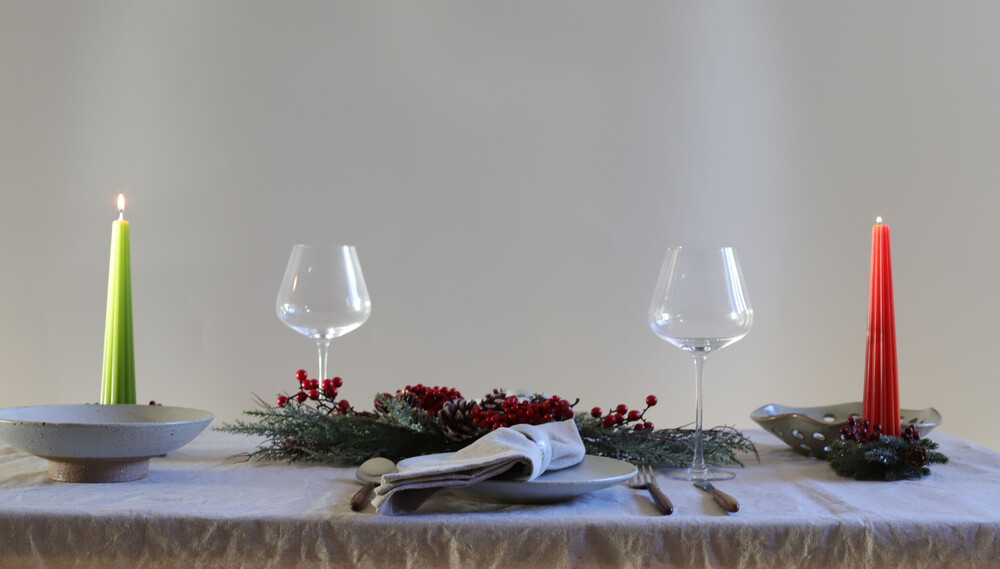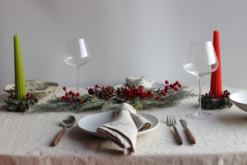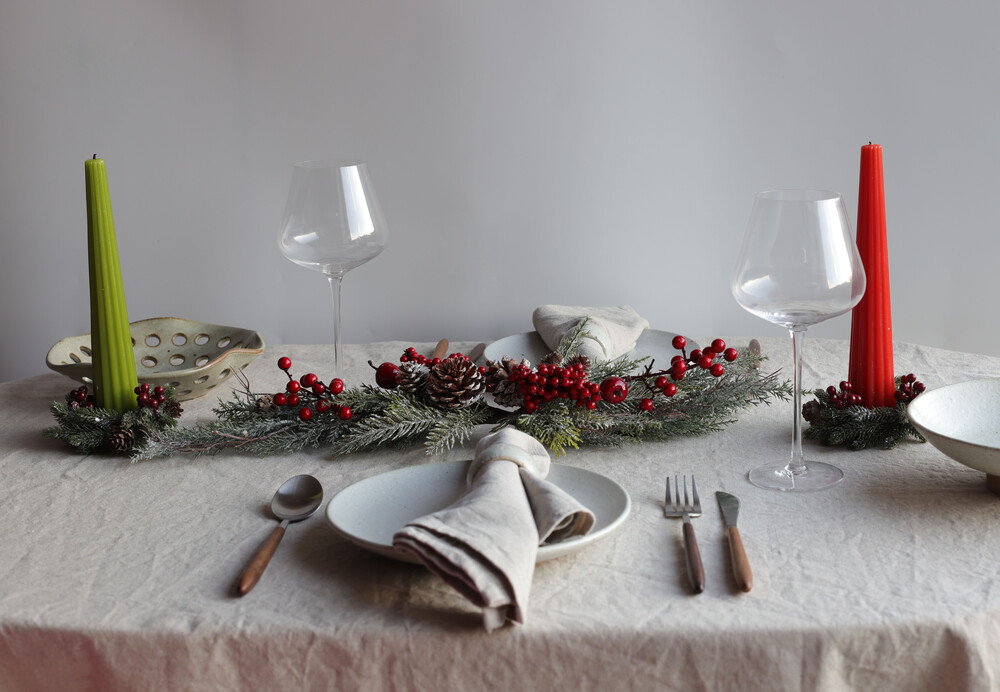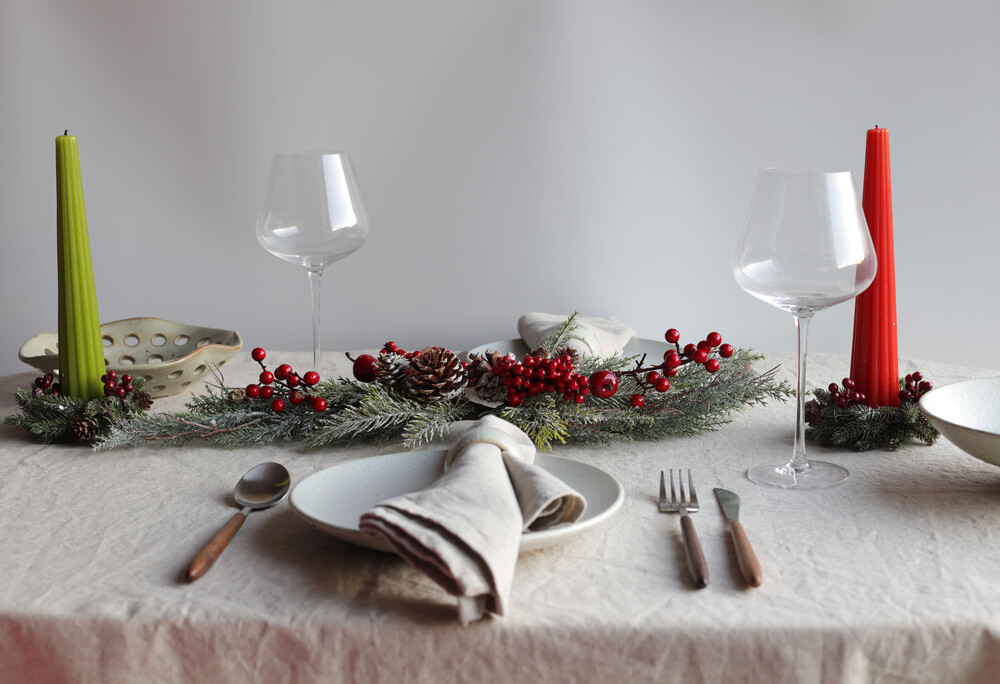 차분한 겨울 분위기에 어울리는 와인잔, 커트러리, 그리고 핸드메이드 센터피스를 더해