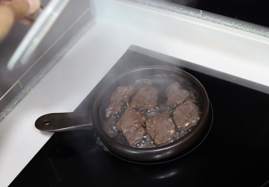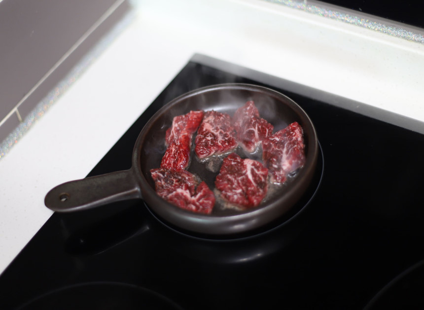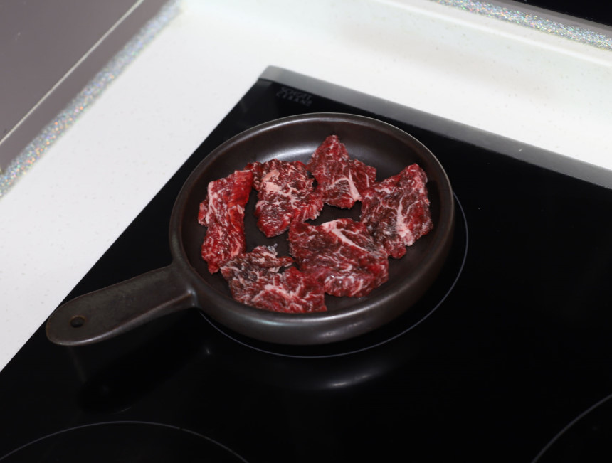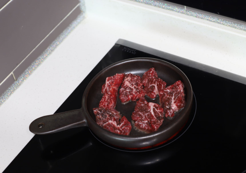 소고기도 일품입니다 아이들 반찬 해주기 너무좋아요 요즘 1인화로도 유행이잖아요~ 1인 세팅으로 쓰기에도 좋고 2인식사하기에도 좋아요 이렇게 소고기를 팬에 올리고 약불-중불-강불로 익혀주시면 흙이 육즙을 감싸주어서 정말 부드러운 소고기가 된답니다