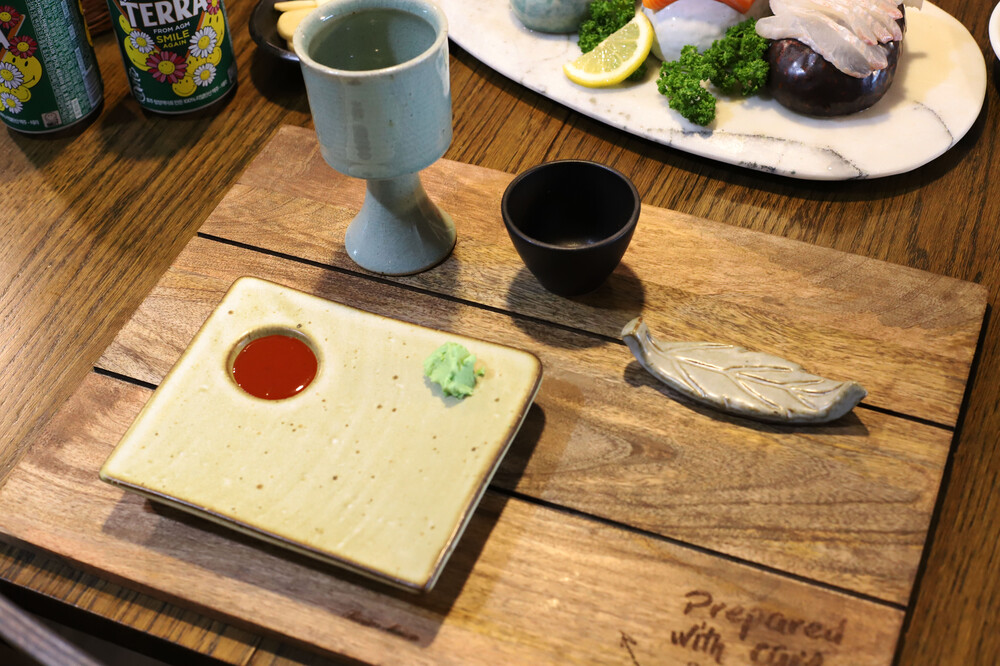 홈에는 간장을 담아 회를 먹거나 케찹을 담아 계란말이를 먹거나 소금을 담아 소고기를 찍어먹는 용도로 참 좋아요 ^^