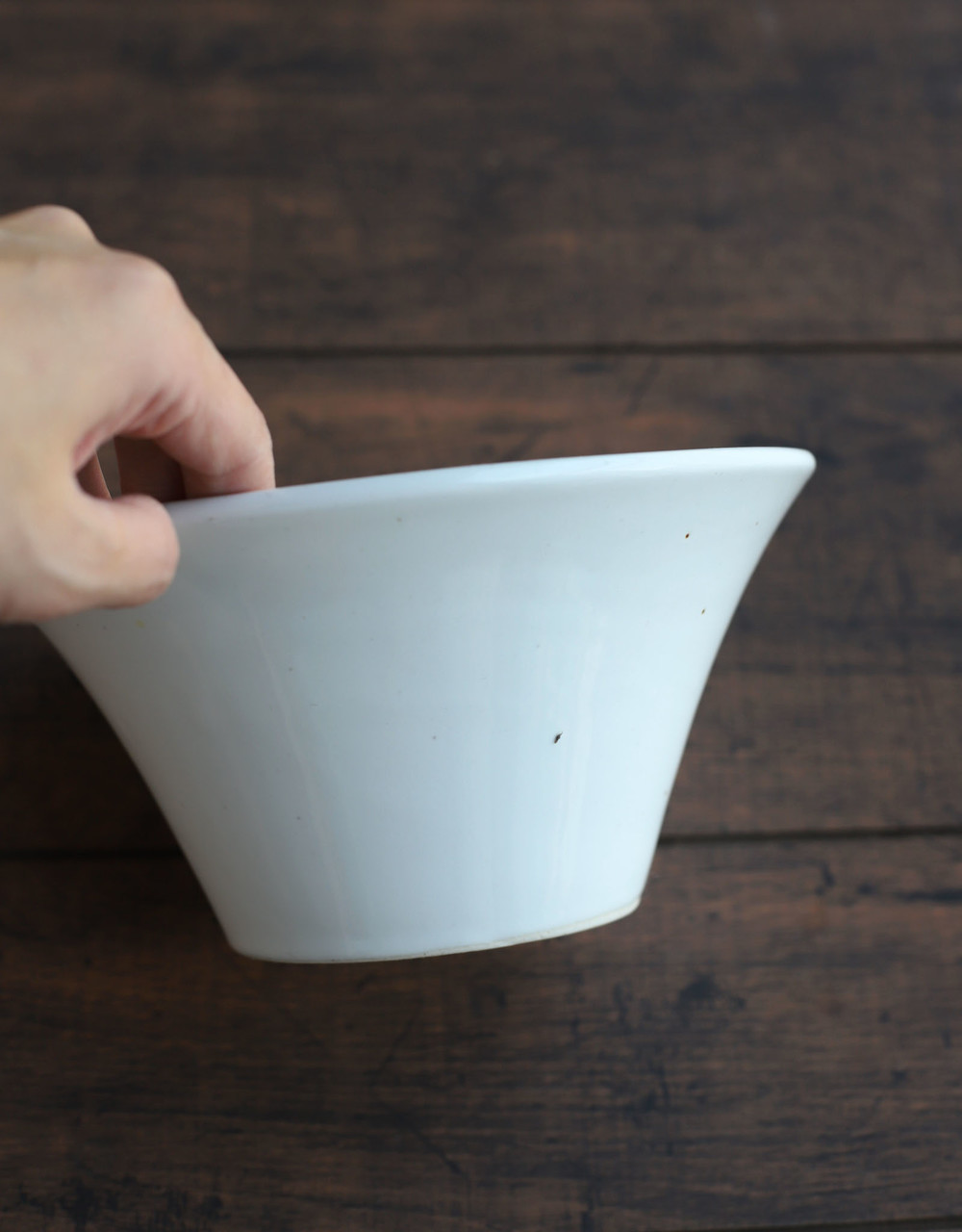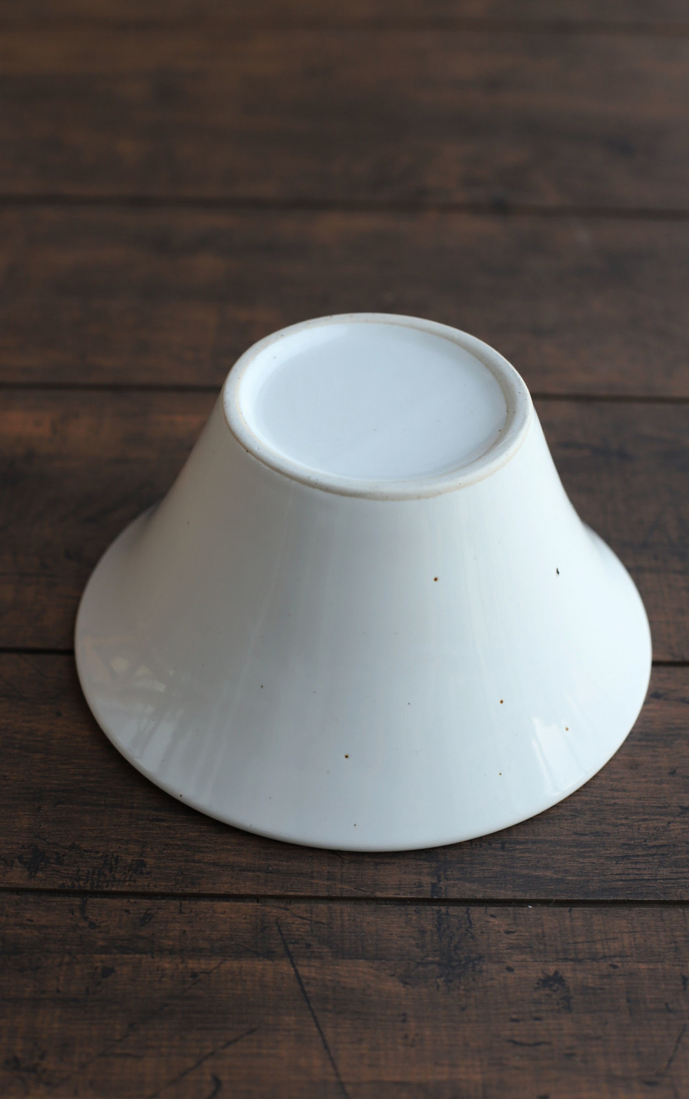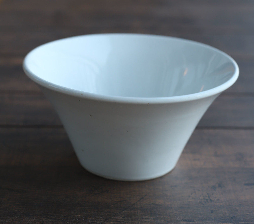 깔끔하고 광이 은은하게 나는 순수면기입니다. 나팔꽃 모양으로 굉장히 예쁜 면기입니다 입 도톰해서 멋스럽고 고급스럽습니다. 밋밋하고 저렴하게 보이는 흰색이 아니라 고온 소성에서 자연스럽게 생겨나는 철분점이 멋스럽게 보이는 핸드메이드 우리 도자기입니다.