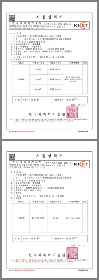매년 한국세라믹기술원 이천분원을 통해 유약유해성,내열성테스트를 진행하고 있어 더욱 안전하고 믿을수있는 제품입니다